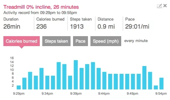 Here are some stats from tonight’s walk on the treadmill: